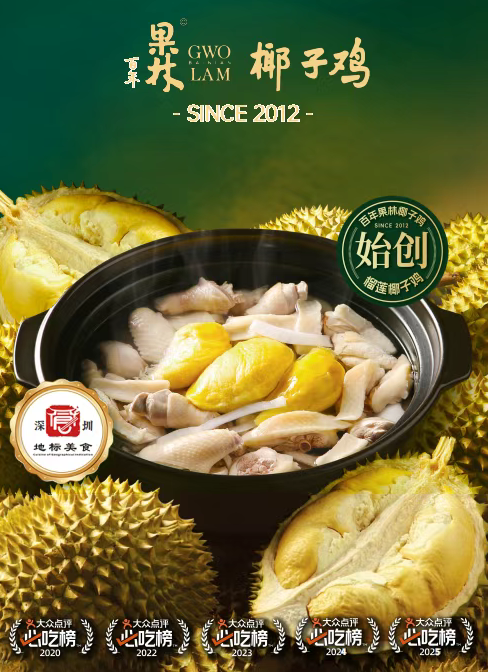 守正更要创新,宇德隆记用勇气与智慧赋予老字号新活力。2012 年创立的 “百年果林椰子鸡” 品牌,打破传统椰子鸡的口味边界,在众多水果搭配尝试中,大胆选用 “水果之王” 榴莲,首创 A 级榴莲果肉椰子鸡,打造出独树一帜的深圳地标美食。为保证品质稳定,品牌严选树上自然成熟的 A 级榴莲,果肉果香浓郁、甜度均匀,与椰水、果林散养文昌鸡完美交融,成就 “皮滑肉爽、香甜可口” 的独特风味,让 “不吃榴莲,也吃榴莲椰子鸡” 成为潮流,更连续五年蝉联大众点评必吃榜,斩获中国饭店协会颁发的地标美食称号。