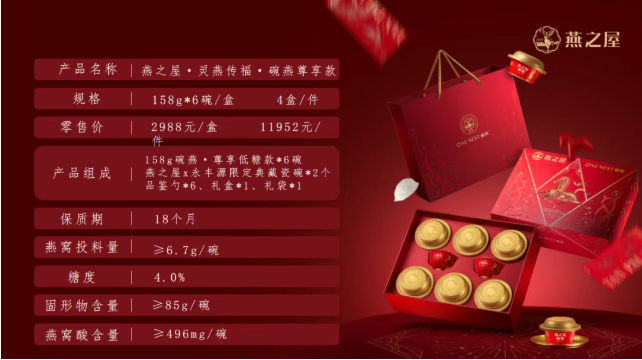 碗燕甄选1% 特钻产区燕窝,原料稀缺,品质臻选,每一口都是燕窝中的上乘之品;搭配国瓷永丰源打造的马年限定生肖碗,红金配色衬着马年吉庆,既适合盛纳燕窝,也兼具收藏价值,好事成双,福气满满。